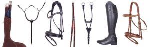 Träns, tyglar, pannband, nosgrimmor, brösta, martingaler, hjälptygel, magplatta, grimma och grimskaft, stövlar, sporremmar, blinkers och pelhamdelta.